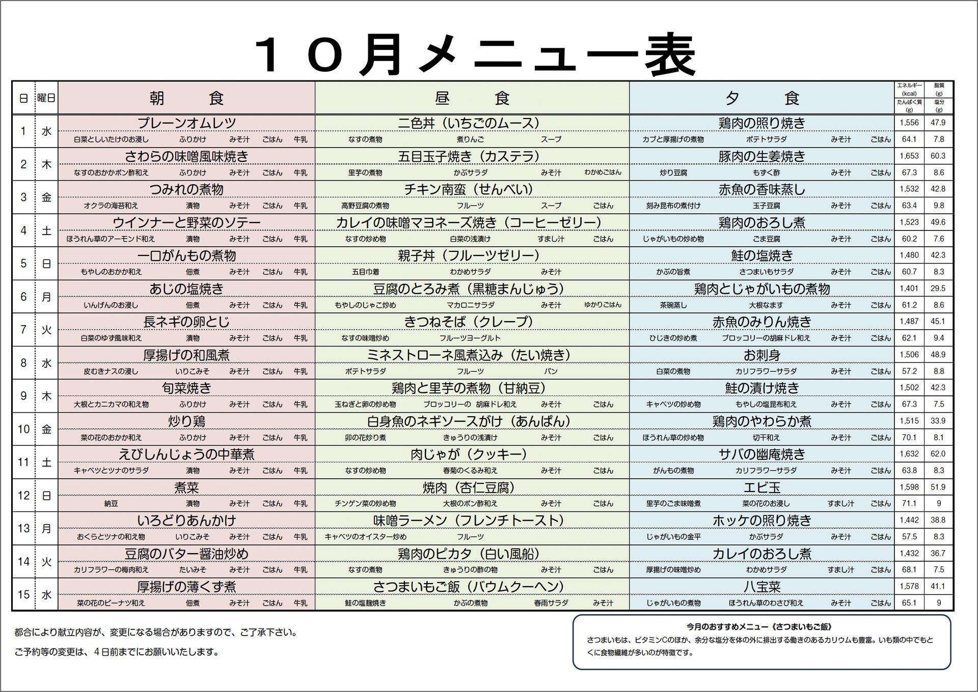 10月1日〜15日までの献立です