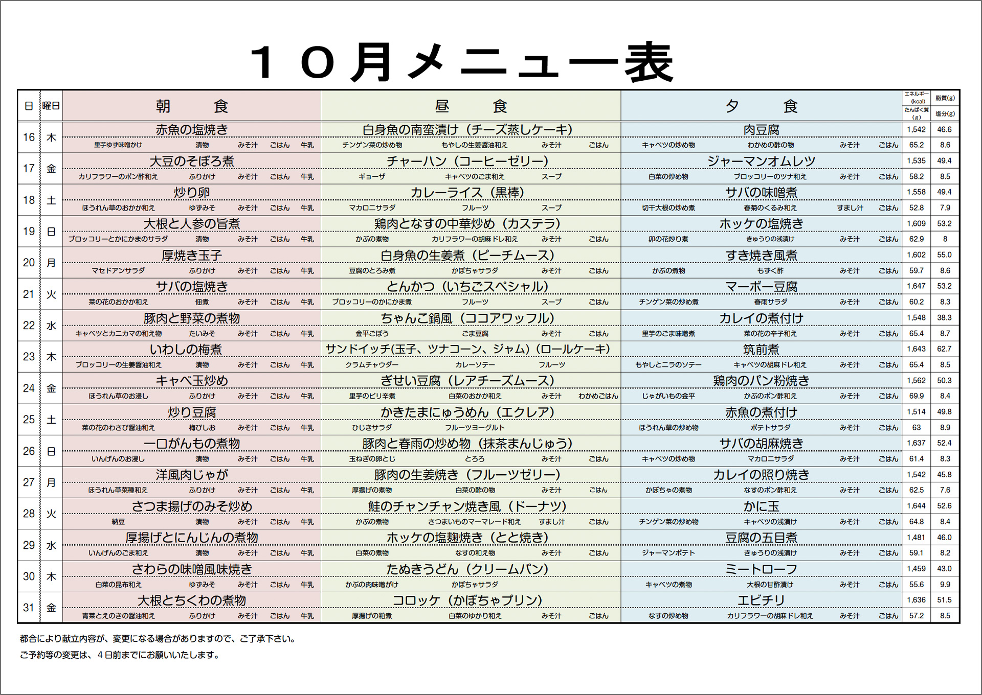 デイサービスご利用の方は、昼食とおやつが書いてある緑の欄をご覧ください。